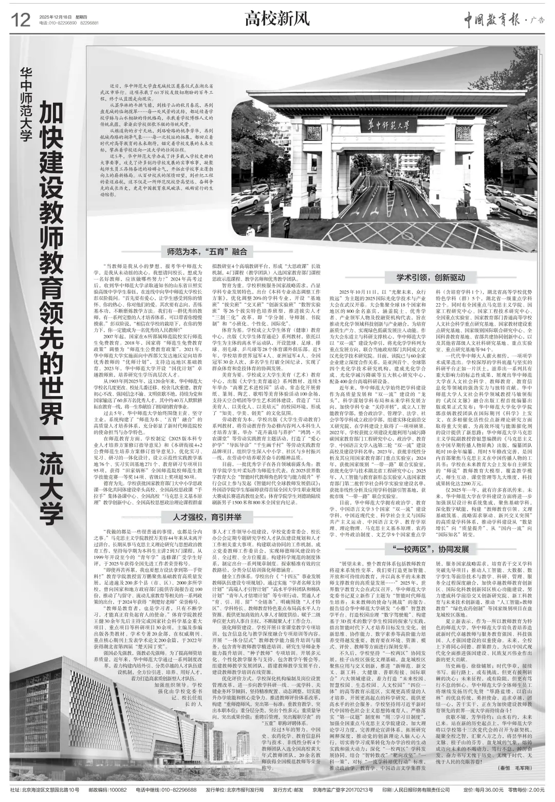 12月18日,《中国教育报》整版刊登《华中师范大学:加快建设教师教育领先的世界一流大学》,生动描绘了近五年来华中师范大学凝聚起师生员工昂扬奋进的磅礴士气,开拓出学校事业蓬勃向上的崭新格局,为加快建设教师教育领先的世界一流大学而持续奋斗!